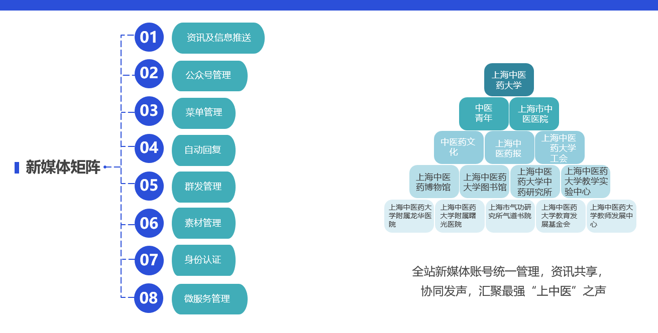 上海中医药大学作为医科院校,拥有众多院系部门的同时还有一系列附属医院,如此之多的下属机构均拥有自己的微信公众号、微博等新媒体账号需要统一管理,做好及时地信息分享和分发,因此上海中医药大学的融媒体建设思路围绕“新媒体矩阵”开展建设,汇聚最强“上中医”之声。