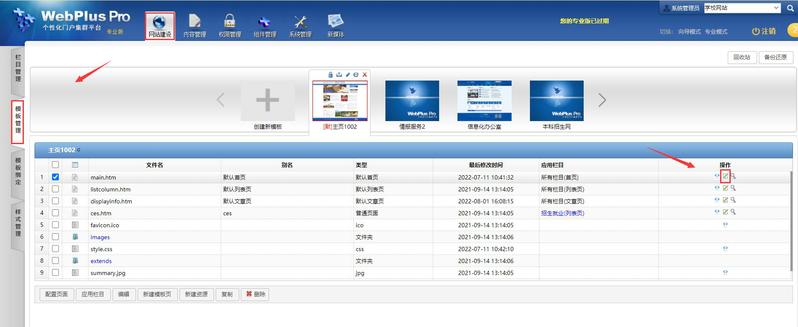 后台【网站建设】进入【模板管理】,点击main.htm的“配置”