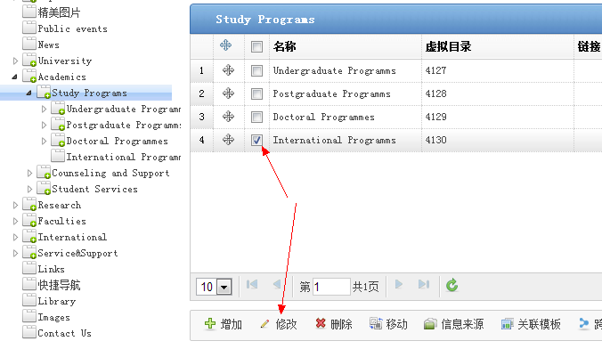 网站建设-栏目管理,左侧选择父级栏目,右侧选中栏目,点“修改”