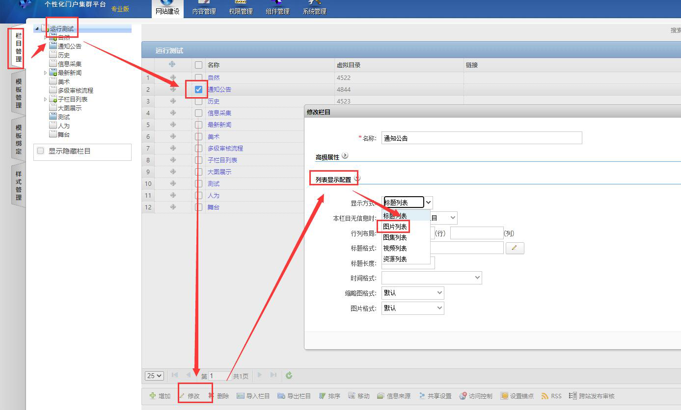 栏目管理”,修改,点击列表页显示配置,显示方式改成”图片列表“,行列布局、缩略图格式根据自己需要。