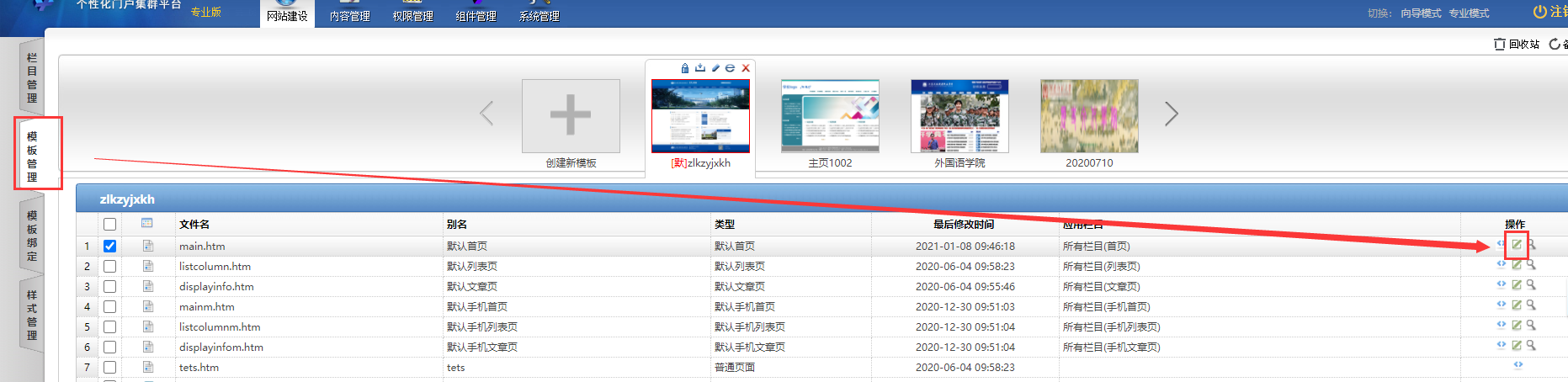 登录后台,点击“网站建设”-“模板管理”;选择需要配置的页面;