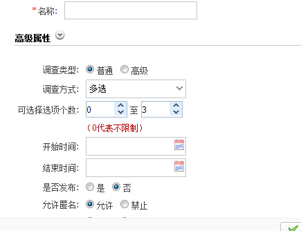 注:如果在线调查,想设置用户可以选择多项内容的话,必须在建立主题之前,在高级属性里面,进行设置。