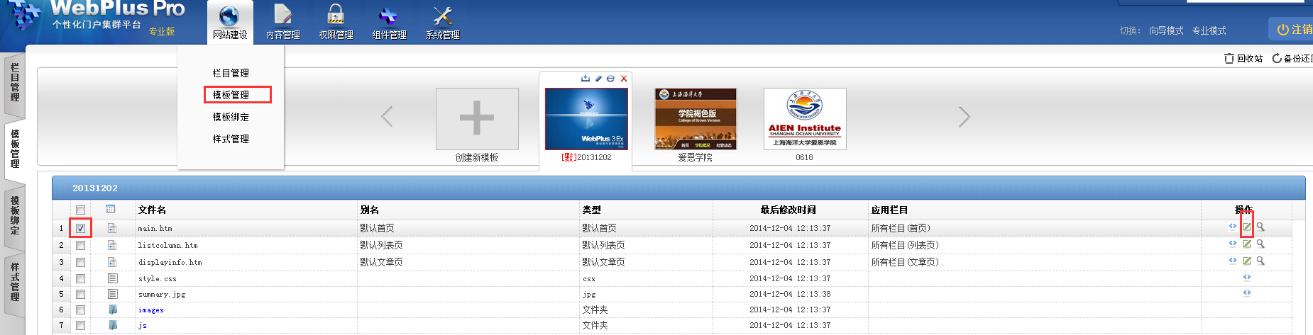 登录后台,网站建设-模板管理,选择要配置的页面。一般是main.htm页面。