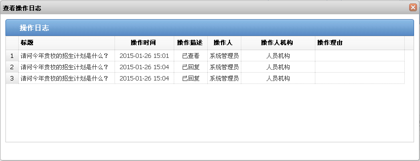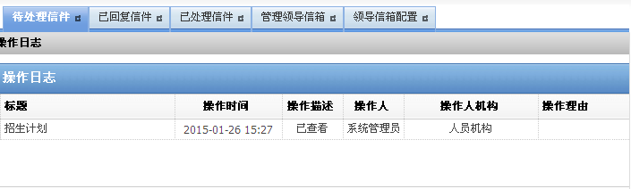 选中一信件,单击“操作日志”,可以查看该信件操作详情信息。如图 1-16所示。