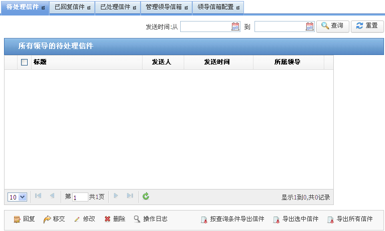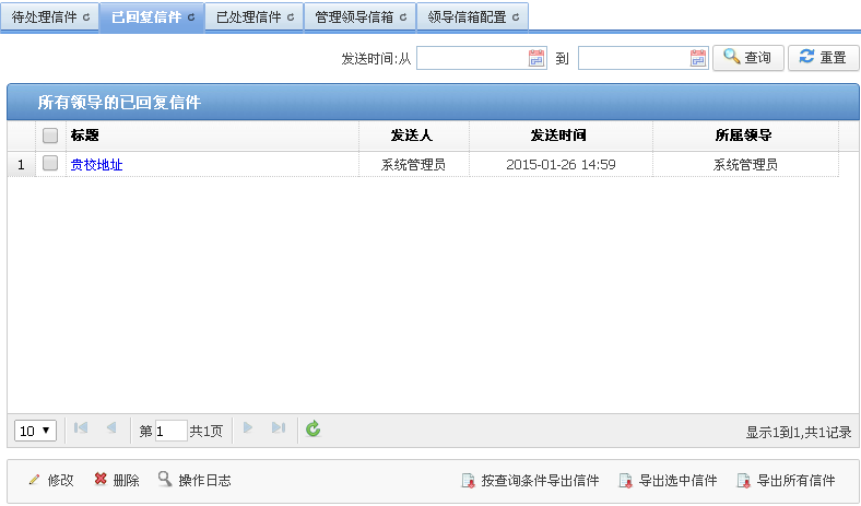 以管理“某某大学”的“管理领导信箱”页面为例,介绍在“管理领导信箱”页面具备的操作。