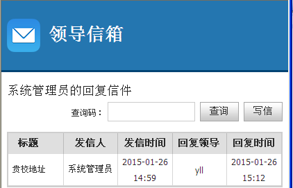 领导信箱是用户与院校领导交流的渠道方式。您可以通过“领导信箱”功能,维护和管理领导信箱内容。
