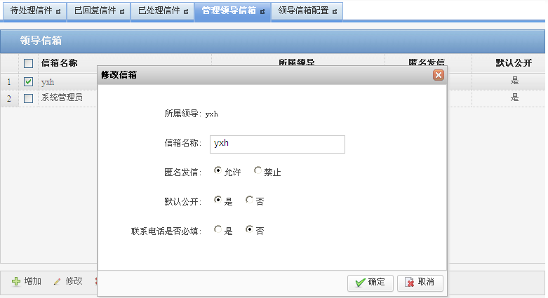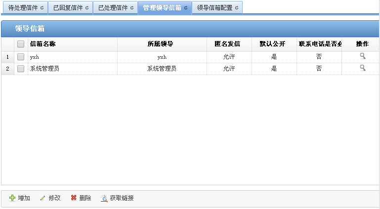 您可以在“管理领导信箱”页签,进行增加、修改、删除领导信箱等操作。
