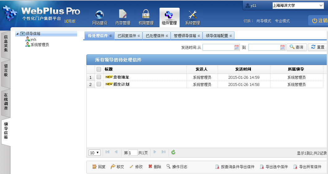 打开“组件管理 > 领导信箱”页签。