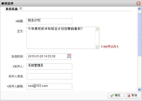 3) 单击“确定”,修改/回复信件成功。