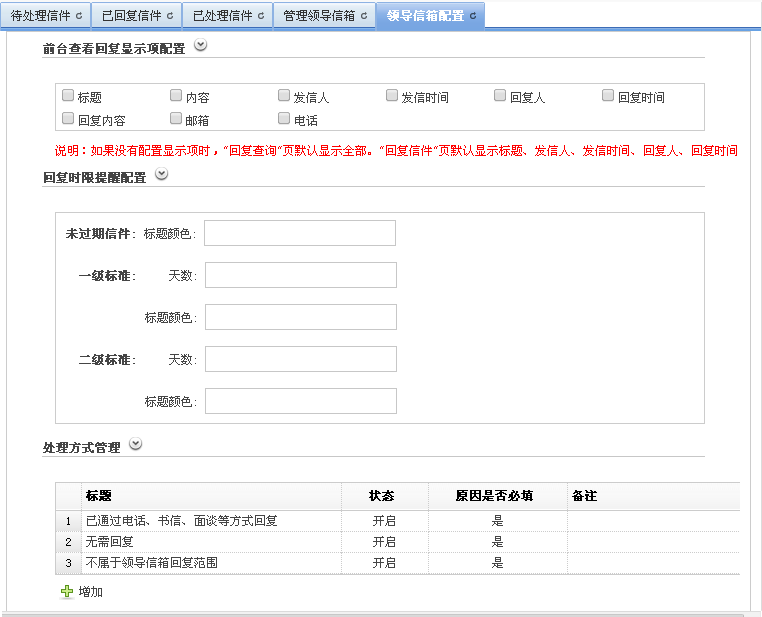 您可以在“领导信箱配置”页签,配置领导信箱的前台查看回复显示项、回复时限提醒以及处理方式管理。