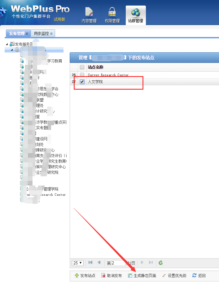 2、选中目标站点(即需要同步的站点或者是新发布的站点)的父级站点,在右侧勾选目标站点,点击生成静态页面。(一般点击后需要一段时间来生成页面,具体时间取决于站点静态页面总数量)