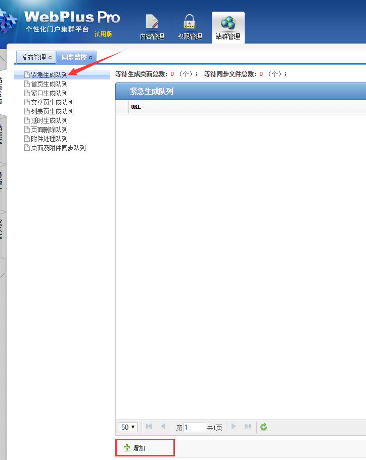 1、在系统站点下,选中站群管理,点击站点发布--同步监控,选中“紧急生成队列”,再点击底部“增加”;