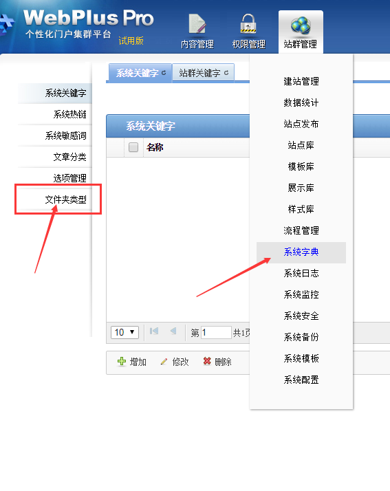 1、先切换到【系统站点】下,然后选中字典管理>文件夹选项;