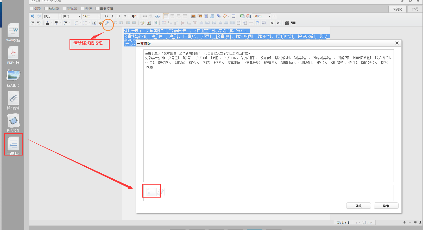 返回到内容管理,编辑文章。选中对应的文章,清除格式;点击左侧的“一键排版”按钮,然后运用之前所添加的排版名称即可。