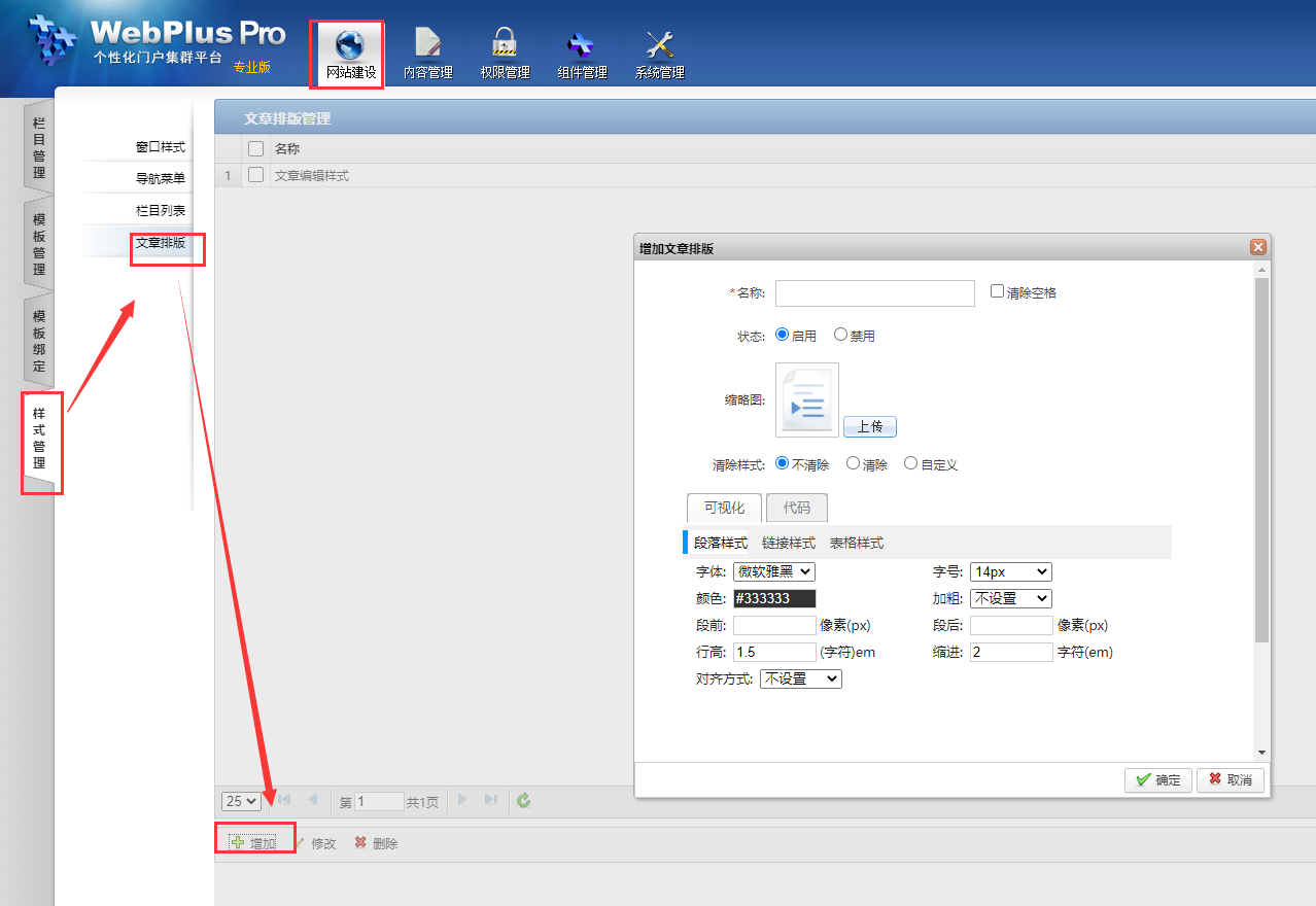 网站建设--样式管理,选择文章排版。添加一个排版的样式。