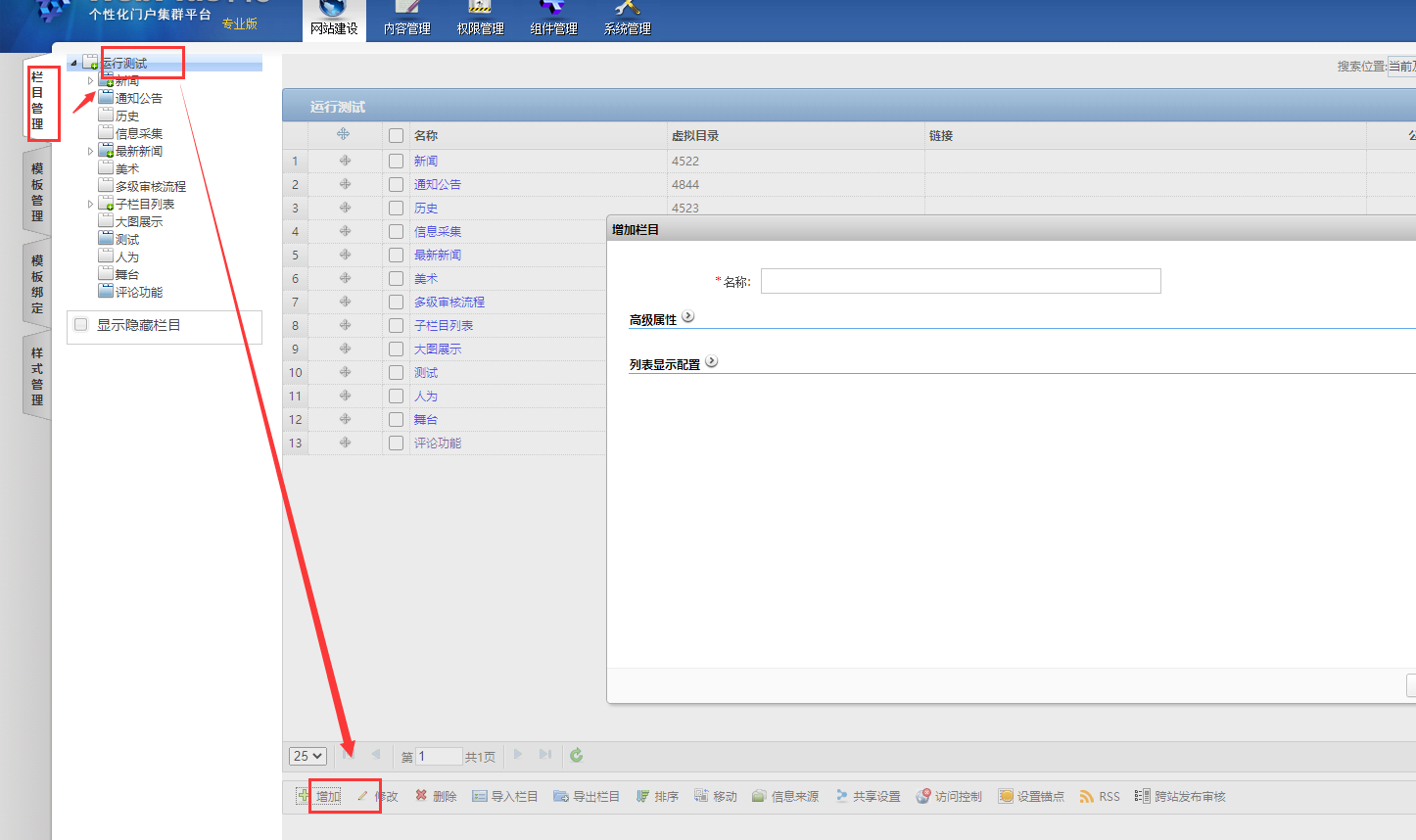 左侧点击增加栏目的父级栏目,右侧点击“增加”按钮。在弹出的对话框里面,添加栏目名称,点击确定。