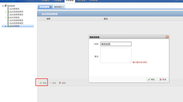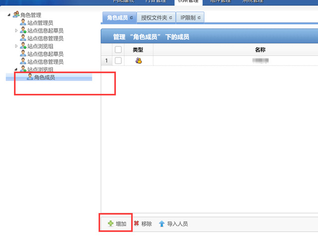 角色成员(人员权限):权限管理—角色管理—站点浏览组—增加浏览组,新添加一个“角色成员”的浏览组;