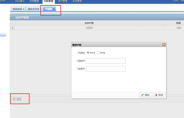 IP限制(校内IP限制):同上,添加一个“校内IP限制”的浏览组;增加可访问的IP段,需将系统默认允许IP段,无限制浏览删掉。填入起始IP,结束IP的范围,点击确定即可。