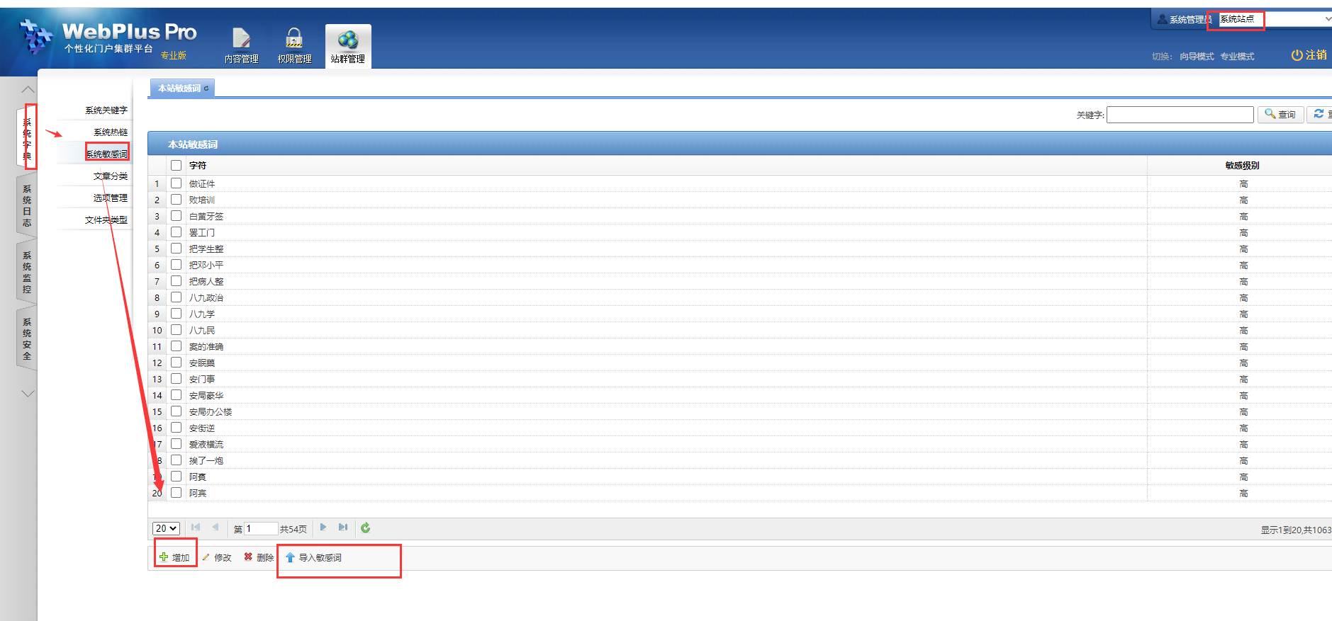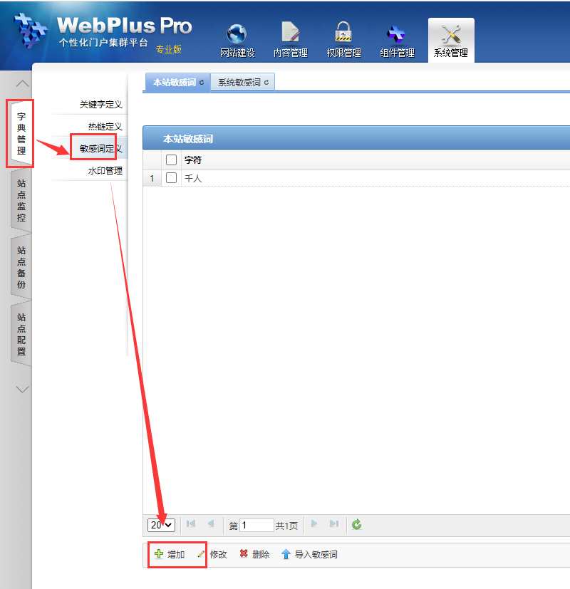 敏感词的管理,可以在系统站点下添加,也可以在某一个站点下增加