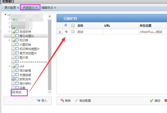 模板管理中,配置窗口,可以选择您建立的“复合栏目”。