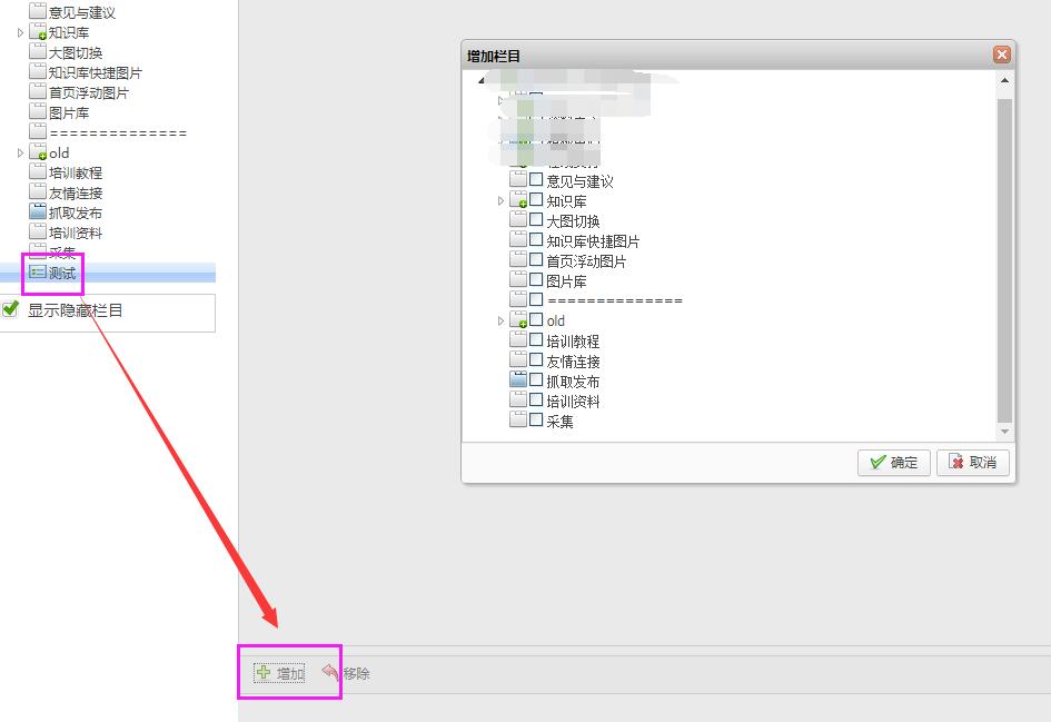由于复合栏目的特殊性,查看此栏目的时候,需要将栏目管理中的“显示隐藏栏目”勾选上。
