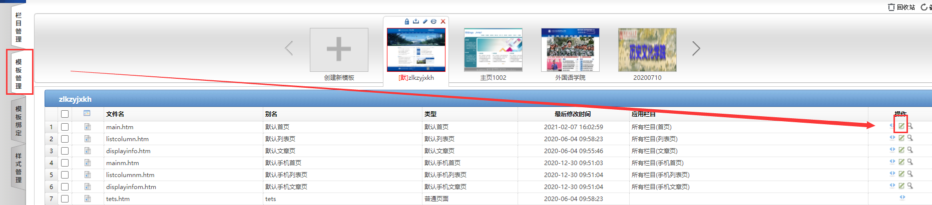 1:网站建设-模板管理,选择要修改模板的main页面,进行相关的配置;
