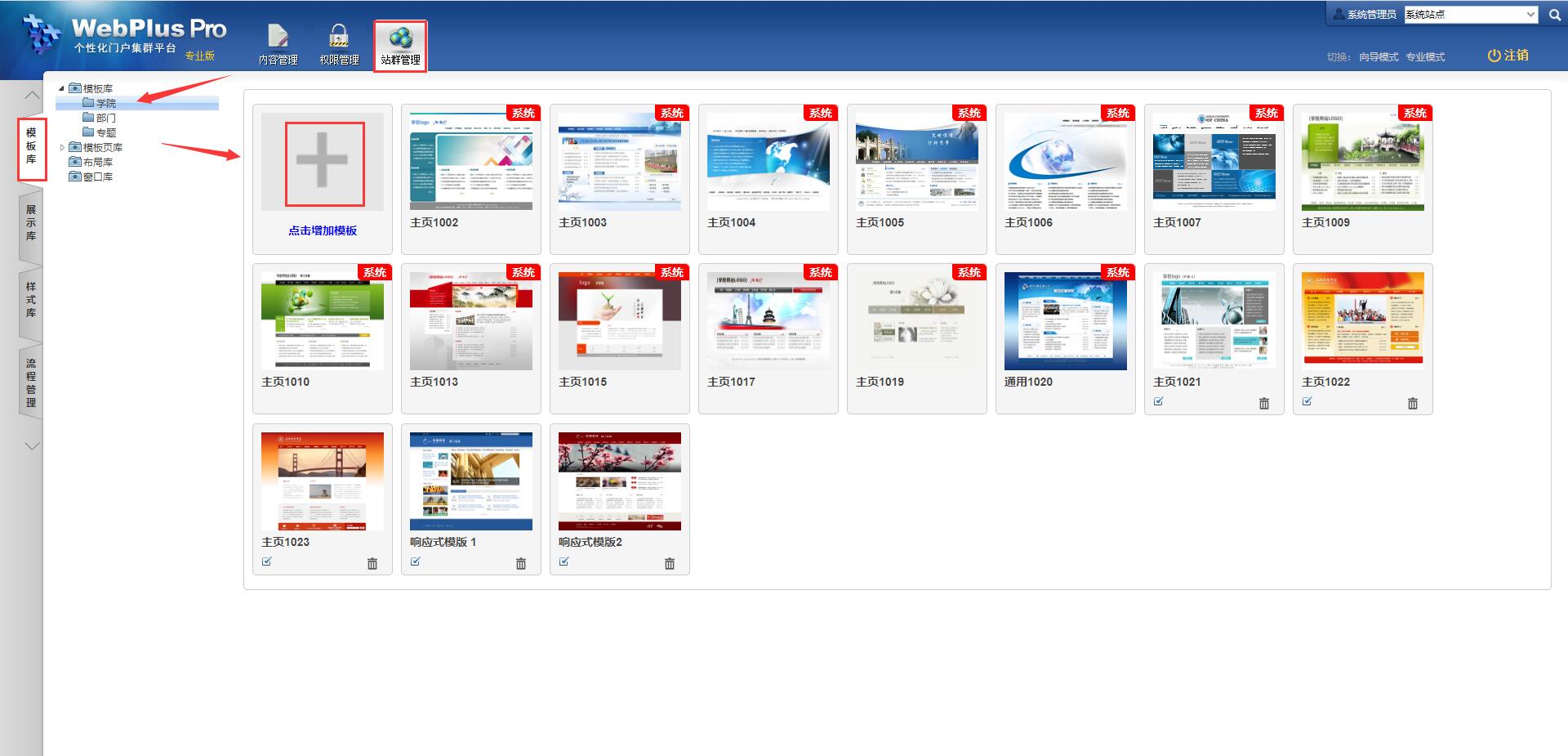 在系统站点下,【站群管理】-【模板库】,选择需要的形式,“点击增加模板”,上传模板;