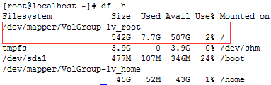 lvextend -l +100%FREE /dev/mapper/VolGroup-lv_root #剩余全部分给逻辑卷