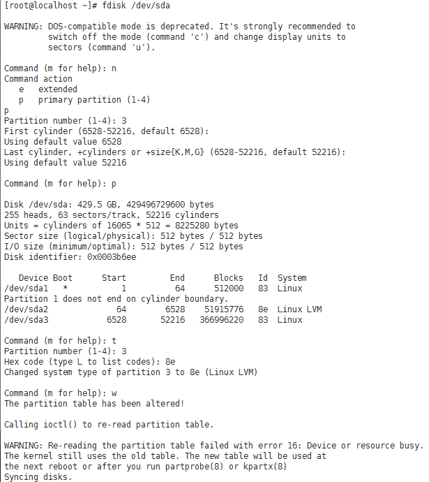 fdisk /dev/sda #创建分区('n' 新建分区 'p' 查看分区 't'修改分区标签 'w'保存)