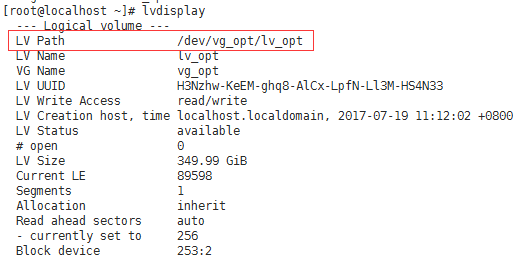 lvcreate -n lv_opt -l +100%FREE vg_opt #创建逻辑卷lv_opt并将卷组vg_opt内的全部空间加入到逻辑卷内