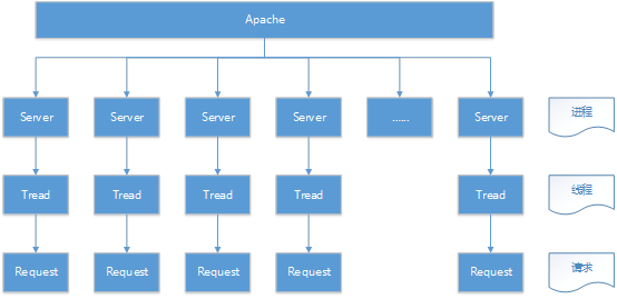 apache在没有用户访问的时候有5个空闲进程。当一个用户访问网站,访问完又离开。则apache的第一个进程就处理了一个请求,从新进入闲置状态。再有一个用户访问网站,访问完后离开。则apache的第一个进程就处理了1+1个请求。这样继续访问3998个用户,这个进程就处理了4000个请求,之后就自动关闭这个进程。这个时候apache就只有4个限制的进程,小于MinSpareServers值所以apache从今建立一个空闲进程。至于为什么处理完4000个请求就要关闭这个进程呢?答案之一:为了防止内存的泄露。