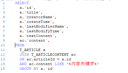 例2:两表联查T_ARTICLE、T_ARTICLECONTENT中内容所含关键字的文章 文章标题、创建时间、修改时间等
