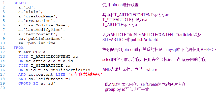 例1:三表联查T_ARTICLE、T_ARTICLECONTENT、T_SITEARTICLE中内容所含关键字的文章 文章标题、创建时间、修改时间、发布时间等