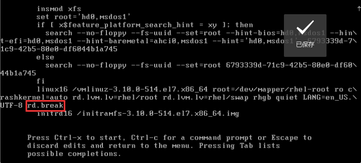 找到linux16开头的行,按end健或者光标移动到行的最后,在UTF-8后面,空格后添加rd.break
