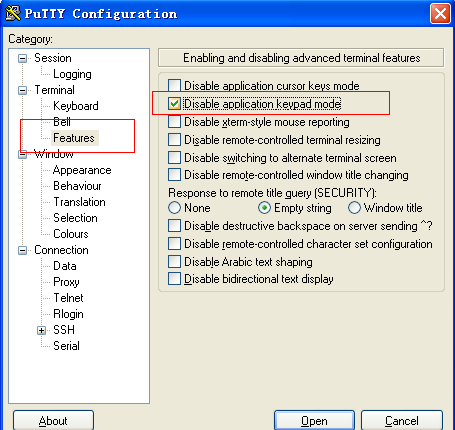 在Fealures配置项中,将“Disable application keypad mode”选项勾选。即可在编辑状态中正常使用小键盘数字键。