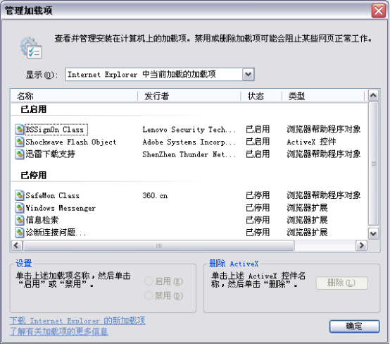 我们点击IE工具按钮,打开“管理加载项”这一选项,会看到如下图所示的窗口: