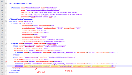 1、在tomcat配置文件server.xml中添加虚拟目录。如下图: