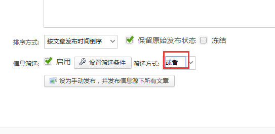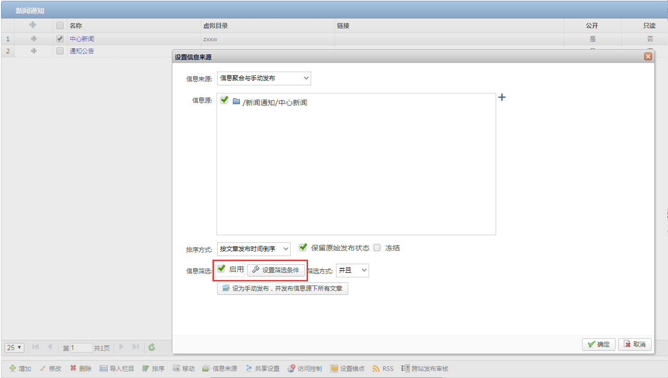 1、后台点击栏目管理,选择对应的栏目设置信息来源,配置筛选条件(注意:如果是要同时满足多个条件,筛选方式选择“并且”,如果是满足其一即可,则选择“或者”)