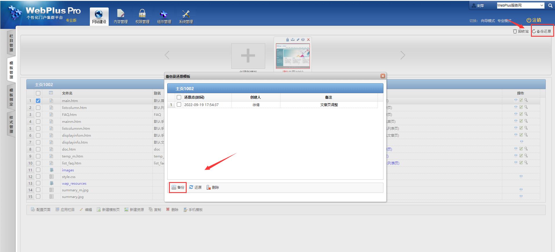 建议修改前把模板下载到本地备份一下,或者在后台点击右上角的“备份还原”对模板进行备份: