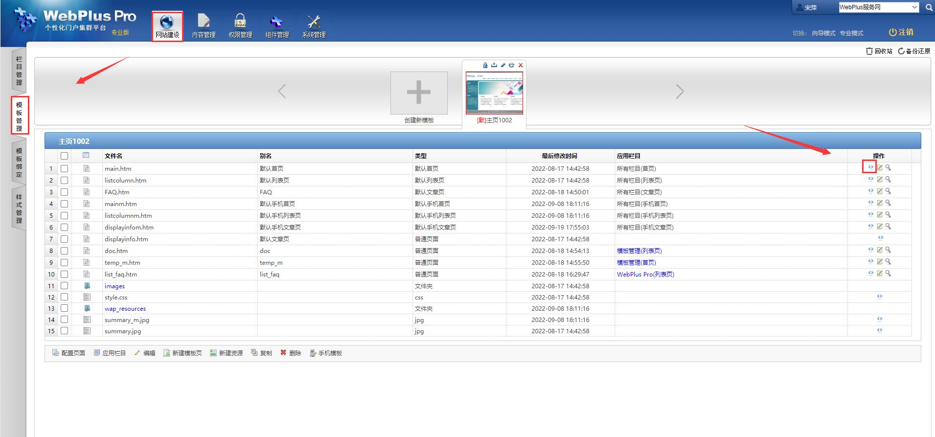 点击【网站建设】-【模板管理】,选中需要修改的模板,点击下方右侧在线修改按钮;(此处以修改首页为例,可根据实际情况自行选择页面修改)