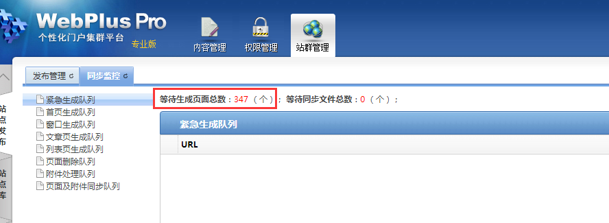 一般在系统站点下,可以看到目前站群后台有多少队列在等待生成。有时会发现,这个数字一直都不变化(不增加也不减少)