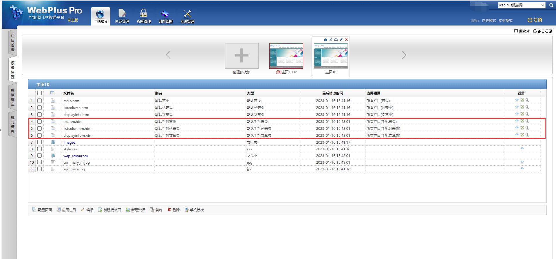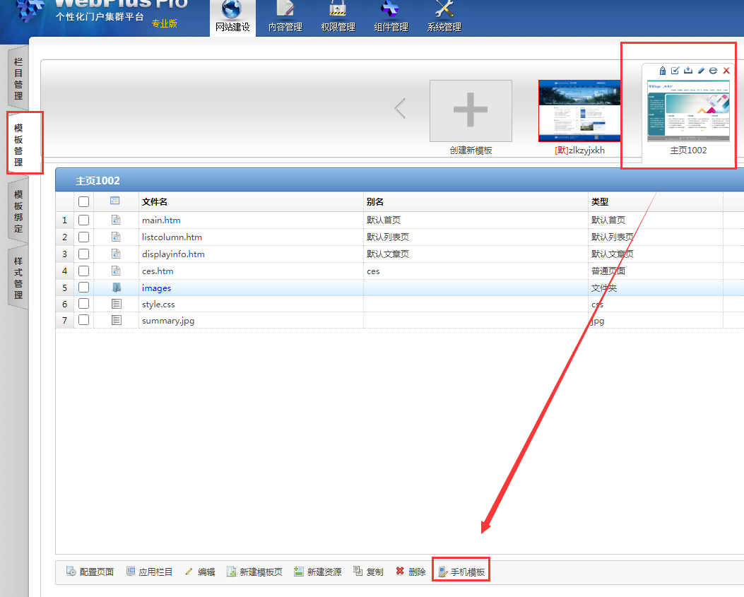 点击【模板管理】,选择对应的模板,点击底部的“手机模板”: