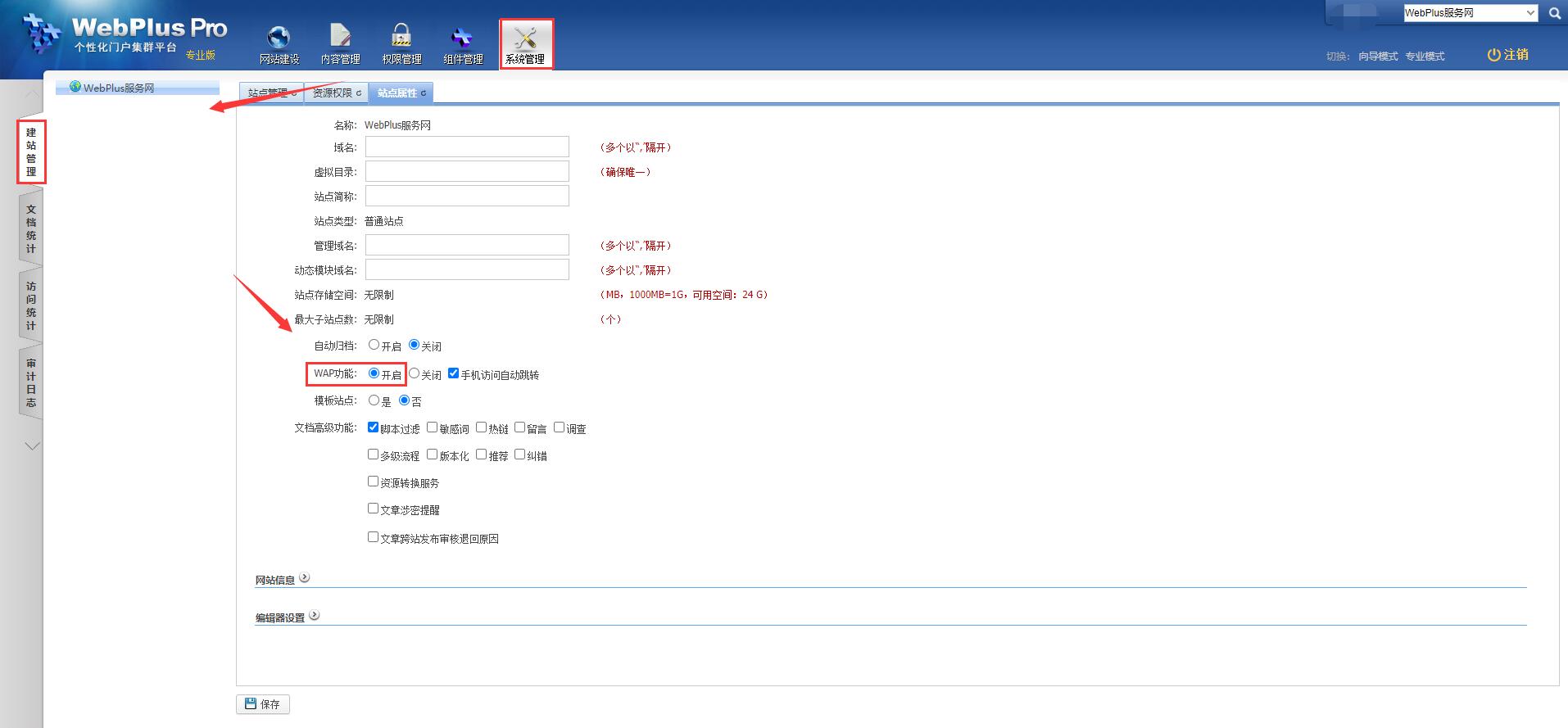 如果站点单独制作了手机模板,首先需要上传到后台。点击【系统管理】-【建站管理】-【站点属性】,将wap功能开启: