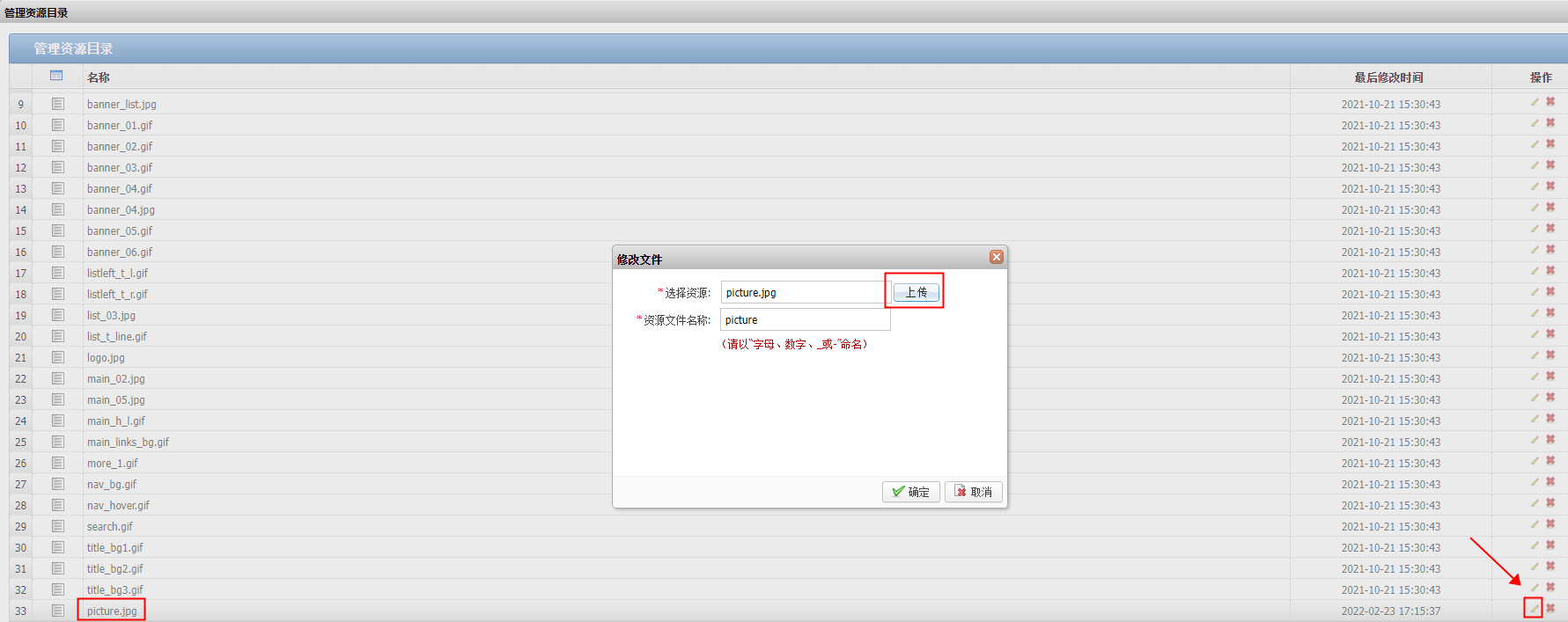 点击images文件夹,找到上述路径中的图片文件(picture.jpg),点击图片名称最右侧的修改,上传新的图片