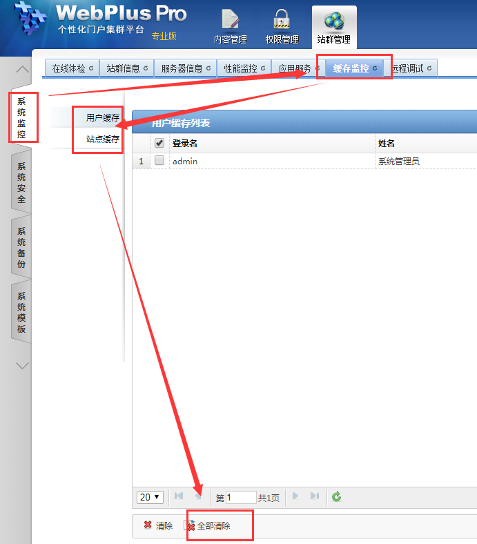 进入系统站点,点击站群管理--系统监控,选择缓存监控,站点缓存和用户缓存都可以在这里清除