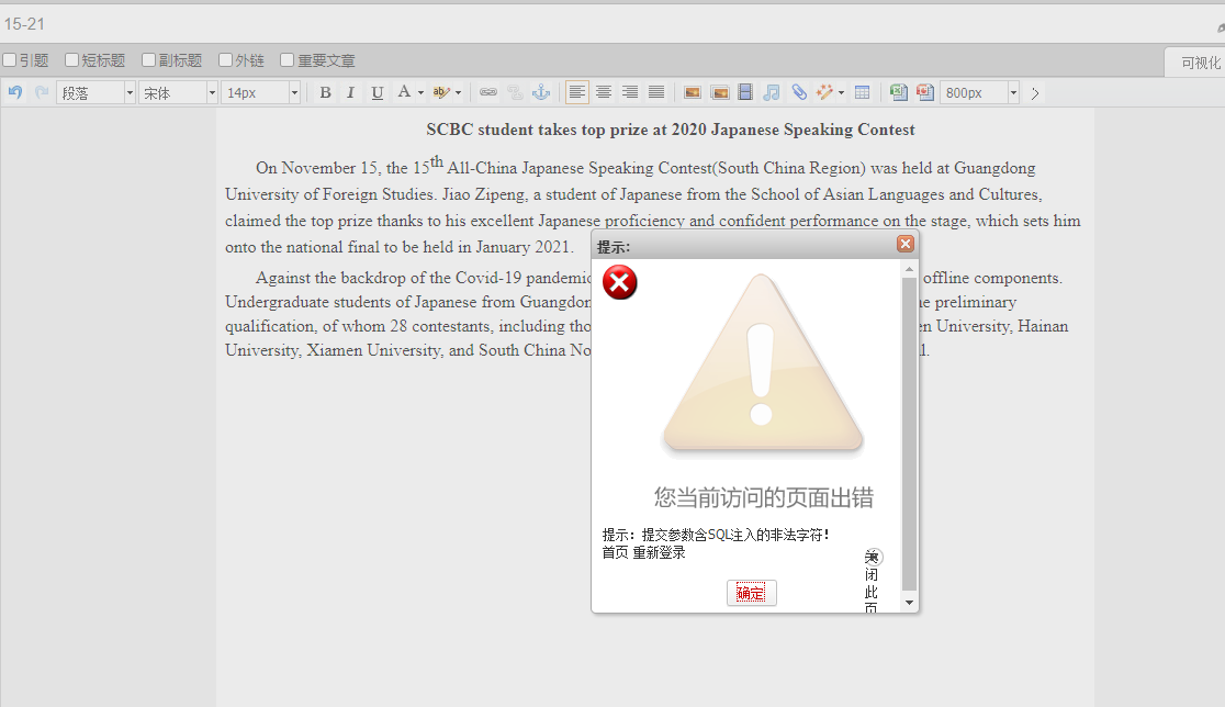发布文章(修改模板)时提示,提交参数含SQL注入的非法字符