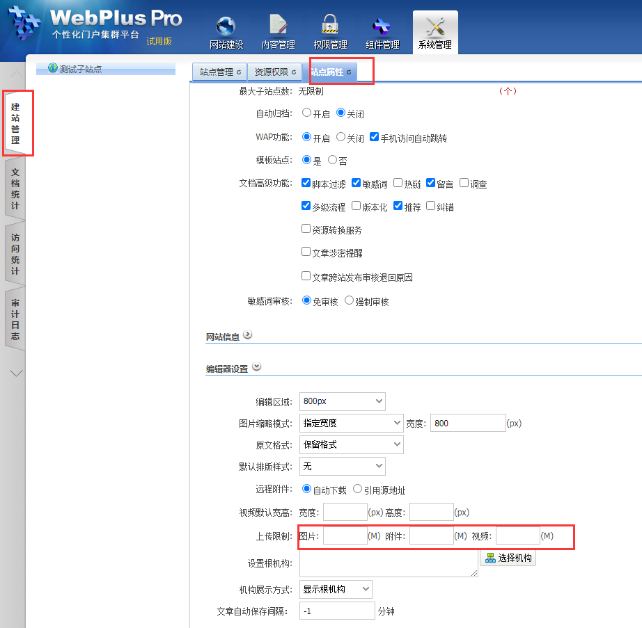 系统管理--建站管理,点击“站点属性”,选择“编辑器设置”,在上传限制这里填写大小