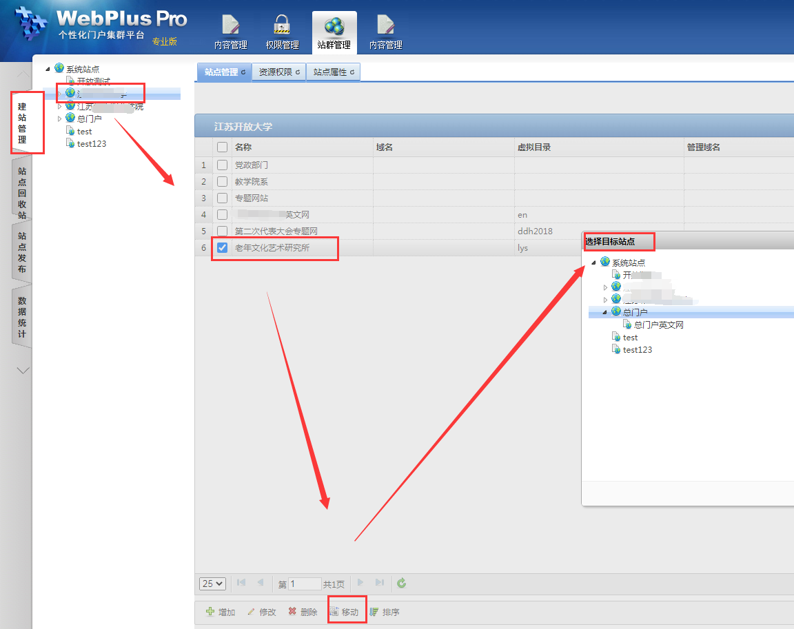 建站管理,左侧选择需要移动站点的父级站点,右侧选择站点,点击移动,选择目标站点点击确定