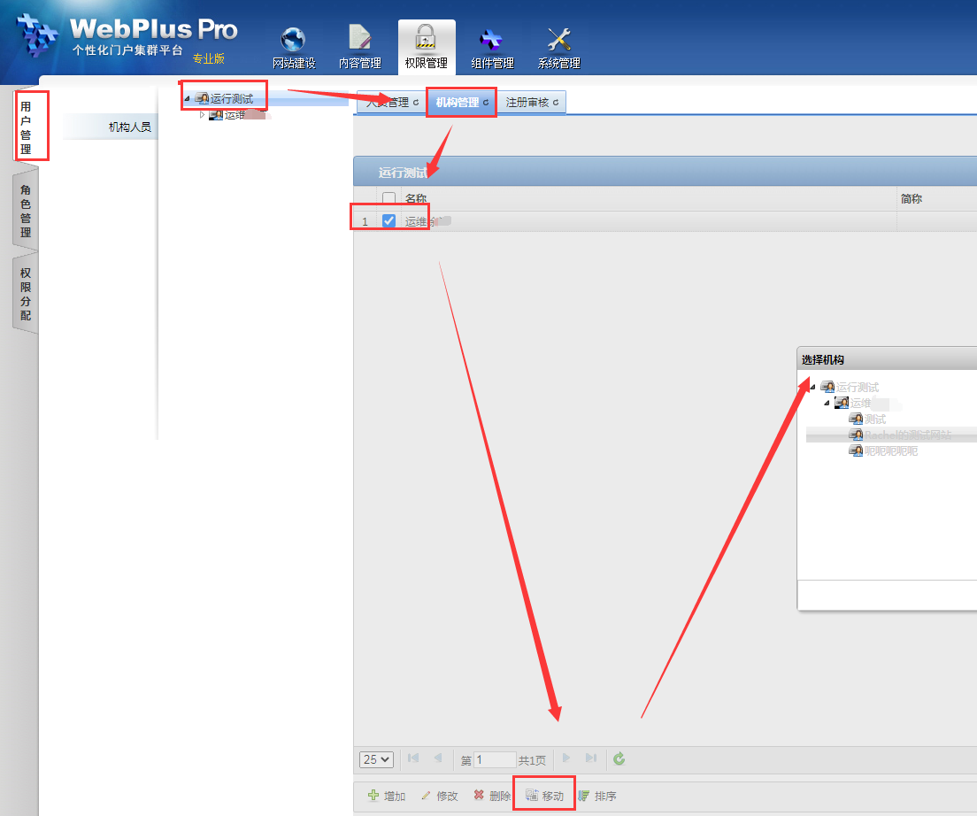 站点移动后,对应的机构也需要同步移动。点击权限管理-用户管理,左侧选择上一级机构,右侧勾选机构,进行同步移动