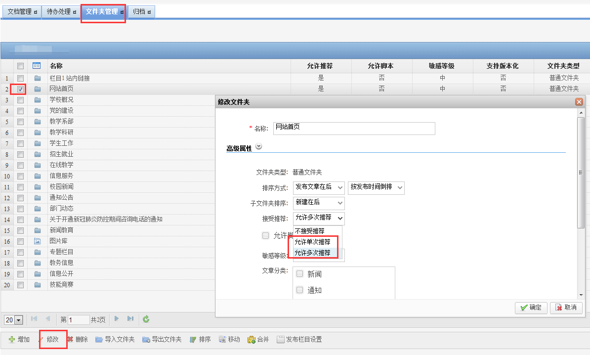 多次推荐,指同一篇文章,可以重复推荐到该文件夹